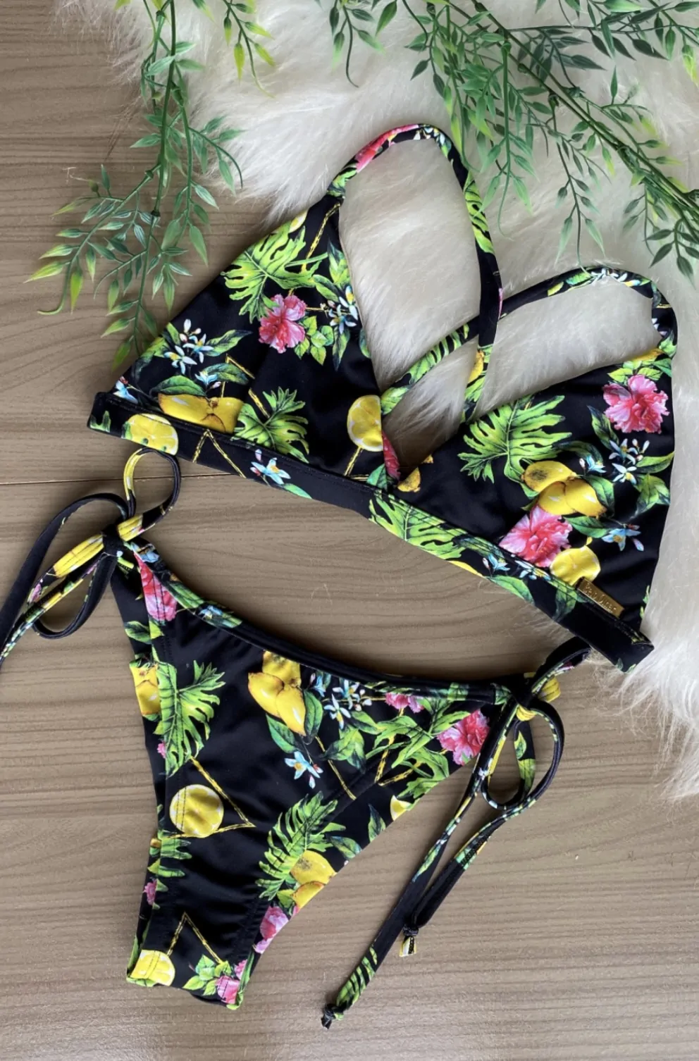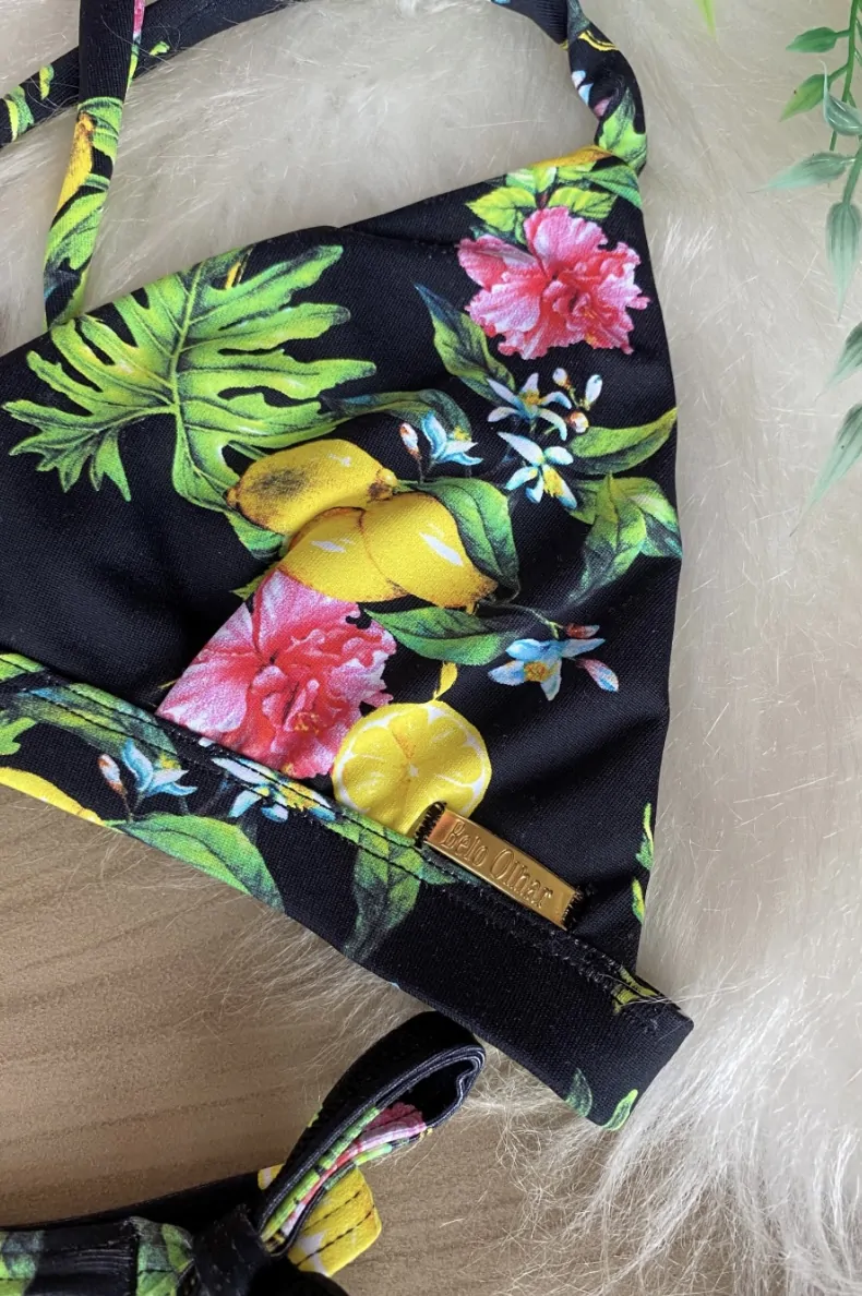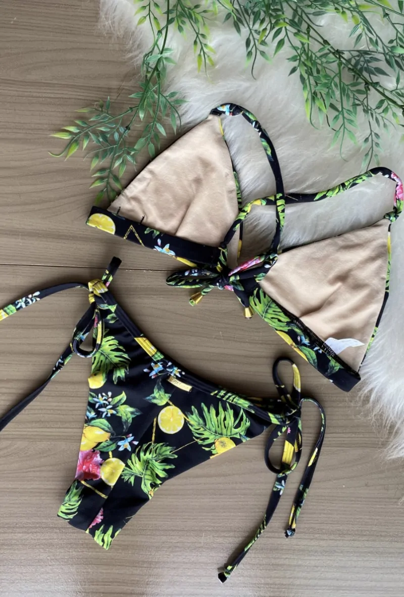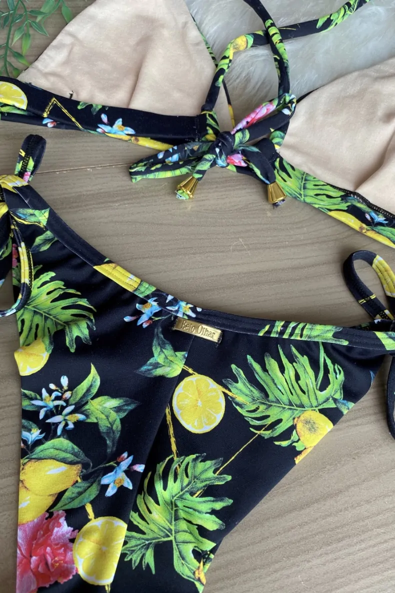 Biquíni cortininha com base encapada de elástico cru. Calcinha fio duplo de amarrar do lado.