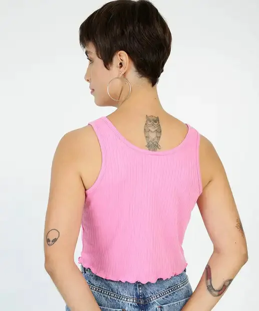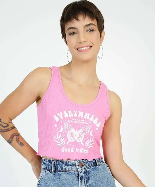 Blusa Regata Cropped Feminina Canelada Estampa Frontal