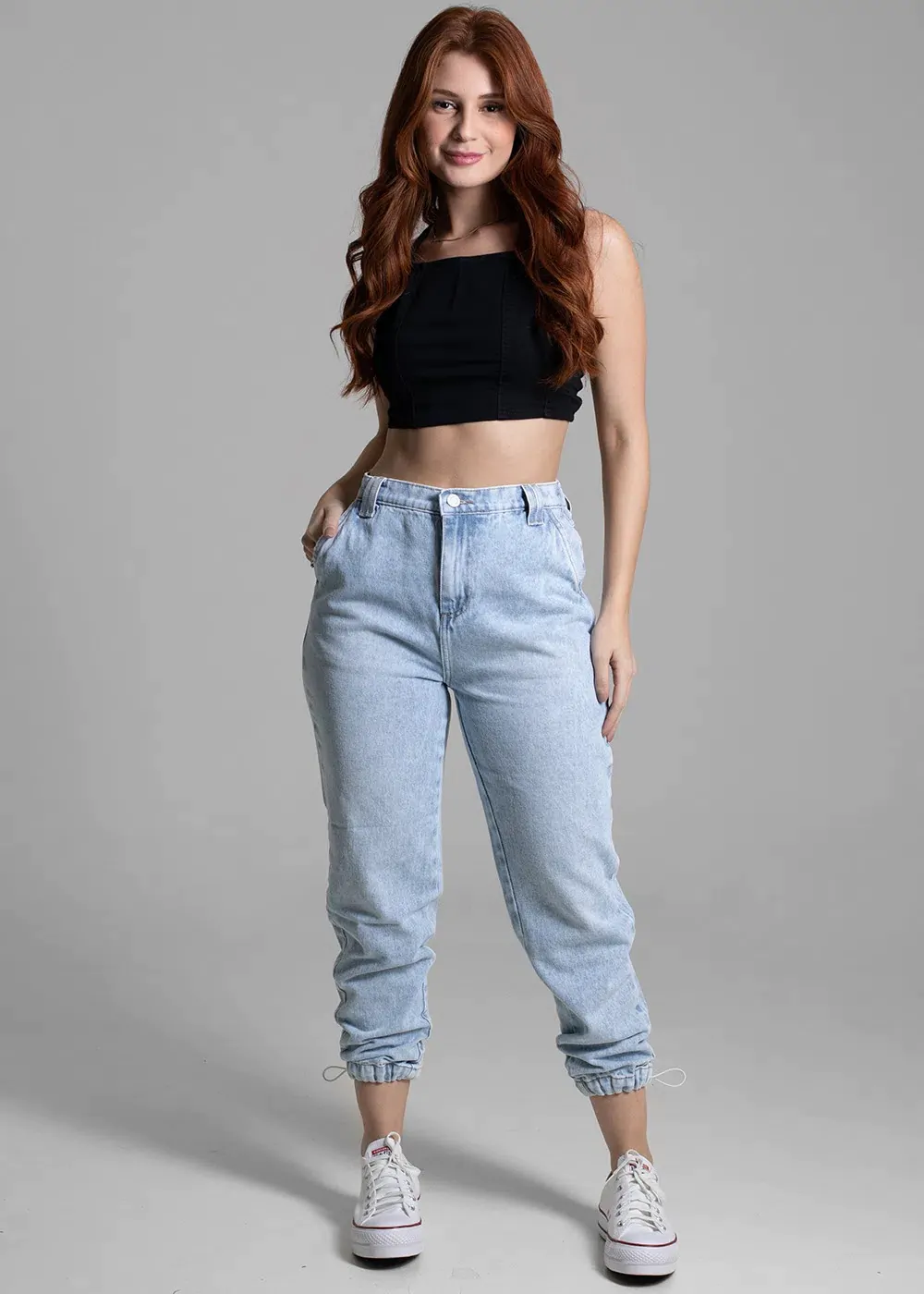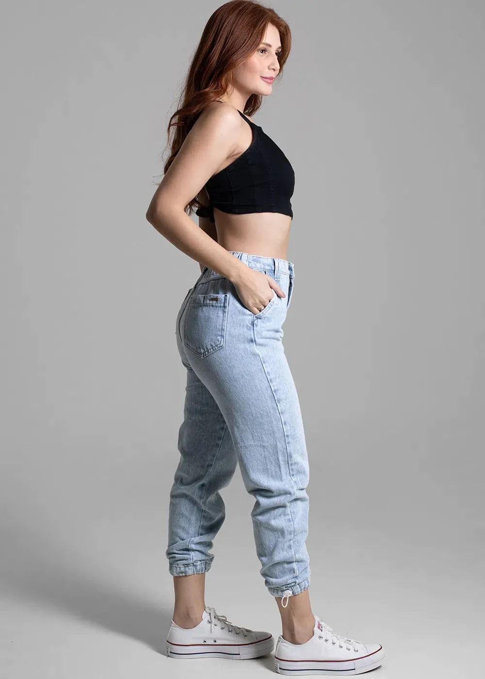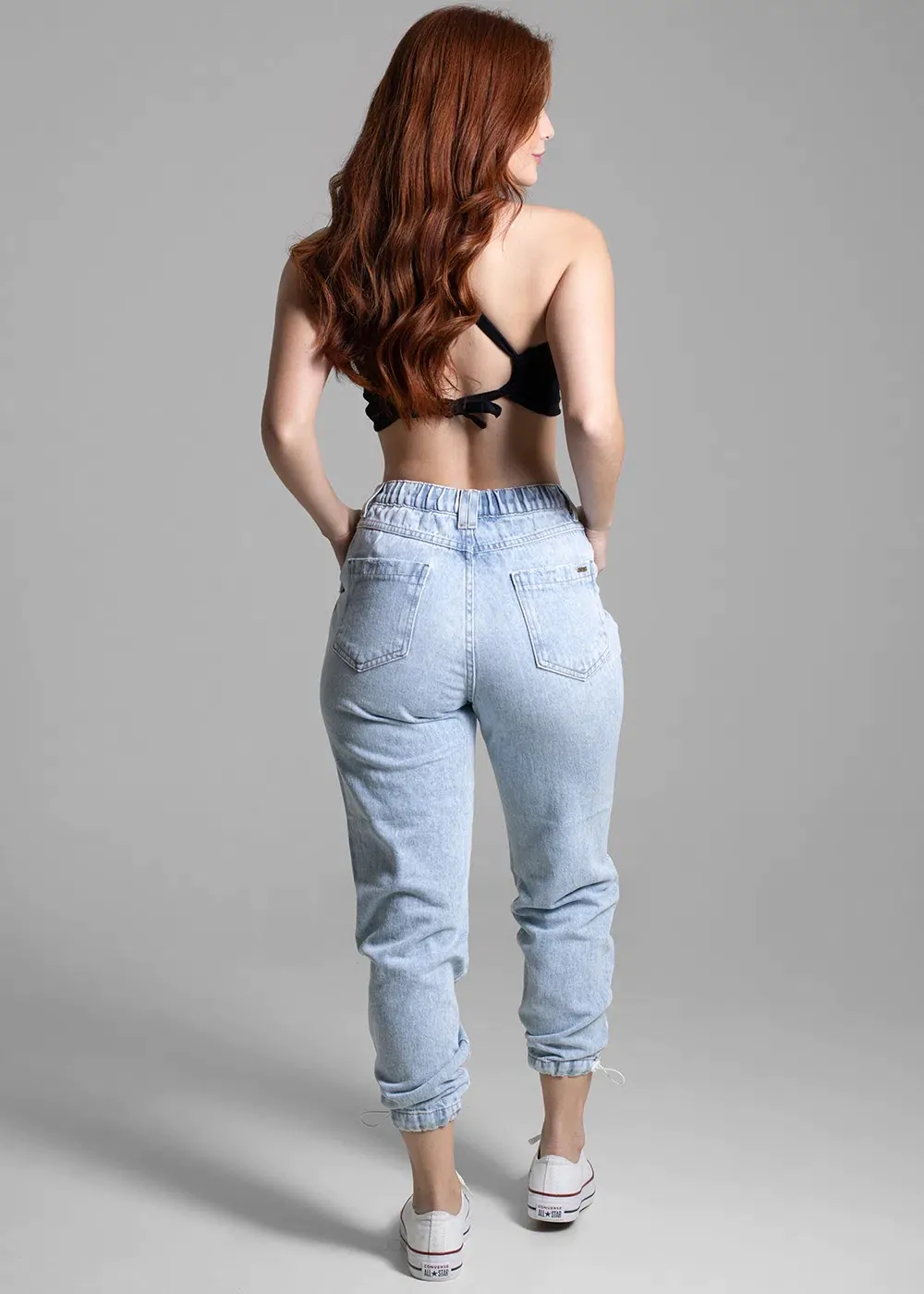Calça feminina desenvolvida em jeans. A modelagem jogging tem caimento solto com barra ajustada por elástico embutido.