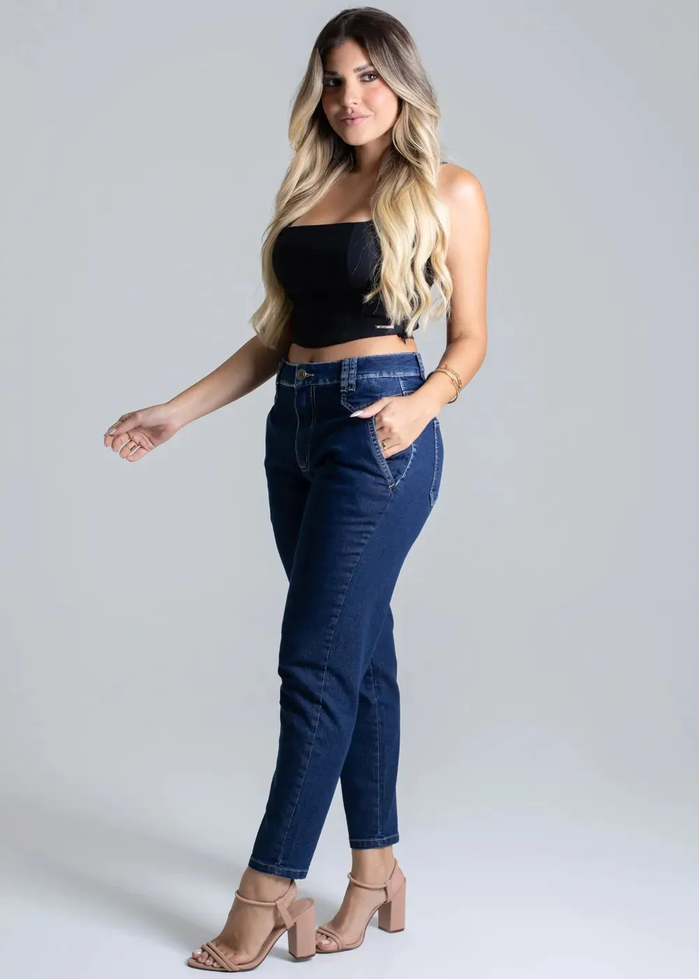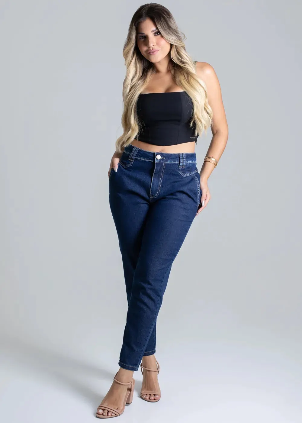 A modelagem mom tem um caimento soltinho nos quadris e coxas ajustando até o tornozelo.