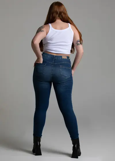 Calça plus size confeccionada em jeans. A modelagem é skinny com caimento super ajustado ao corpo.