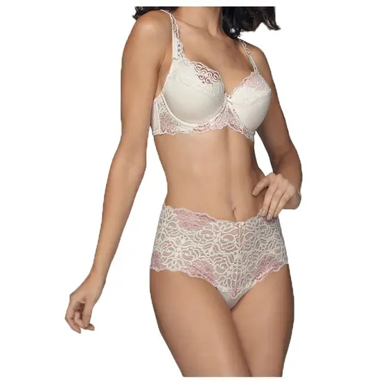 Em elastano. Cós em renda elástica larga com leve transparência.