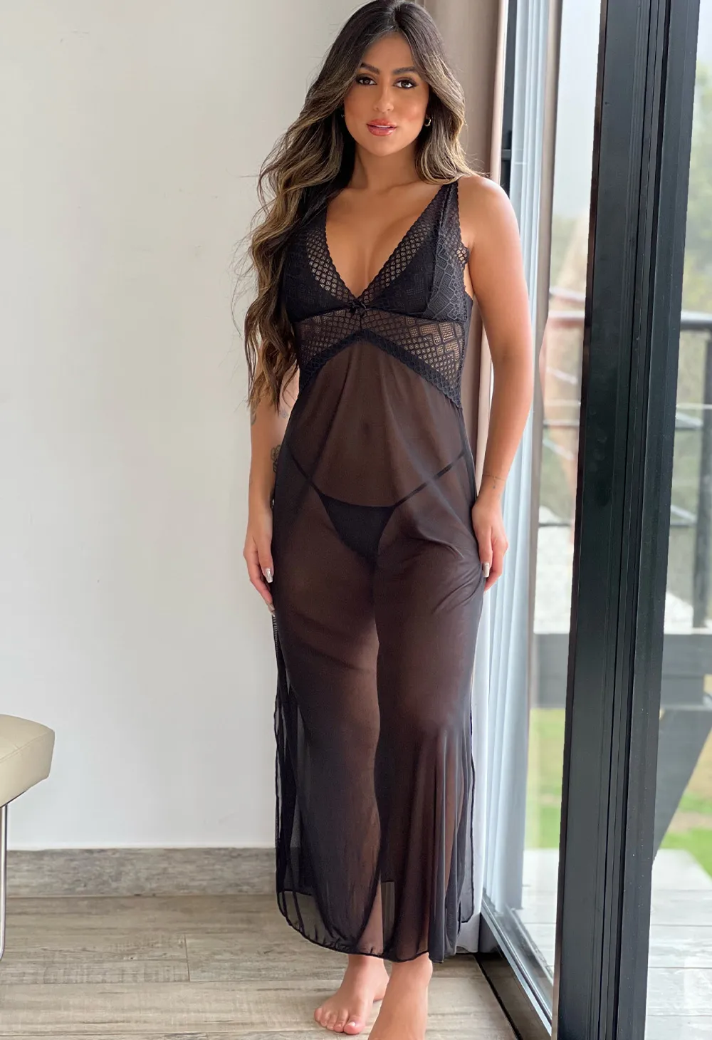 CAMISOLA LONGA SEXY EM TULE E RENDA...