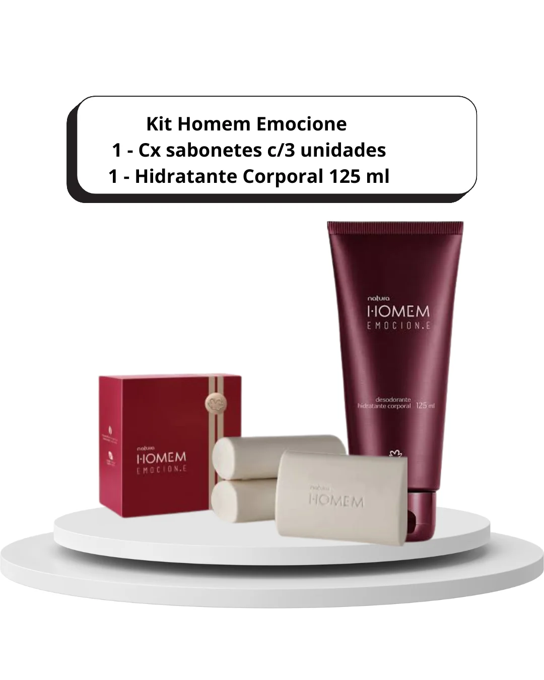 Homem Emocion.e Trio de Sabonetes. São três sabonetes de 110 g cada, formulados com manteiga de cacau e glicerina vegetal para um barbear suave e confortável, com fácil deslize da lâmina. Limpa sem ressecar a pele e perfuma o corpo todo com seu aroma amadeirado. Para deixar esse presente ainda mais especial, ele vem em uma caixa com com uma fita metalizada estampada.