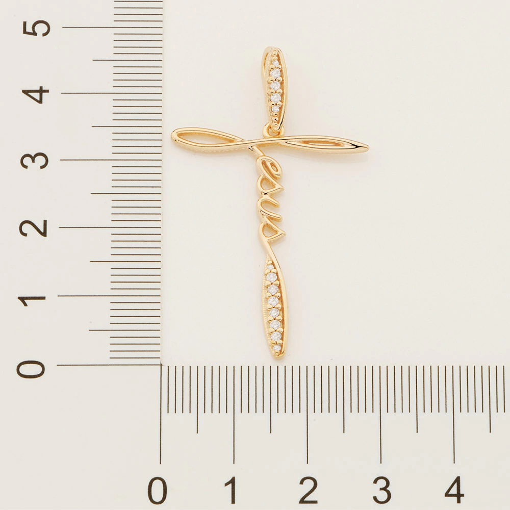 Pingente escrito jesus, cravejado por 4 zircônias de 1,0 mm e 9 zircônias de 1,50 mm. med 4,5 cm x 2,8 cm