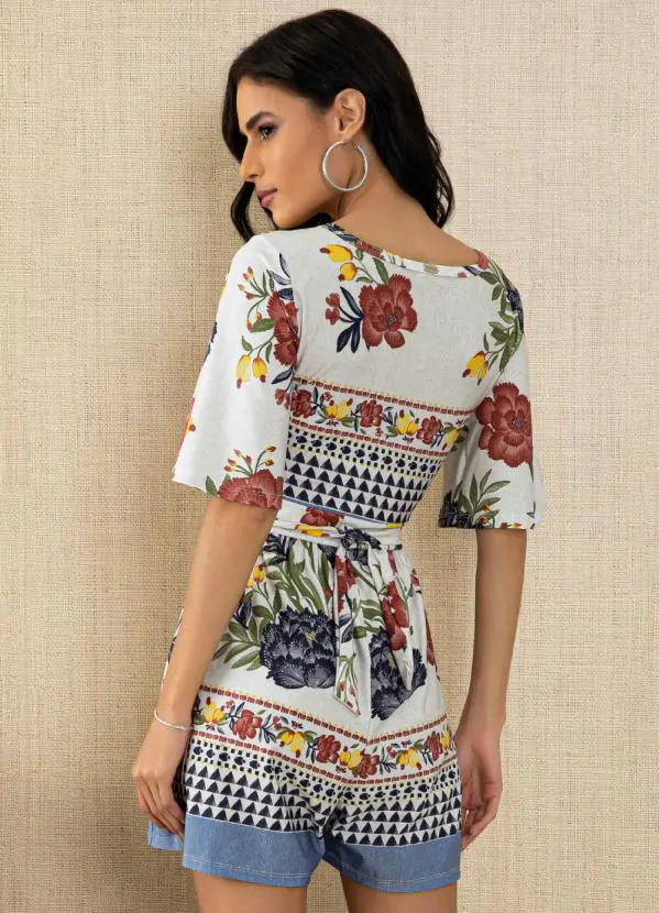 Macaquinho em malha fria acetinada de poliéster e elastano. Macaquinho com decote V, manga curta evasê, recorte duplo na cintura com elástico e franzido e faixa fixa na cintura.
