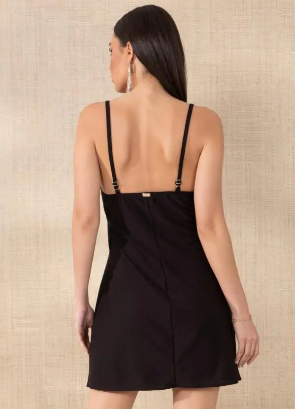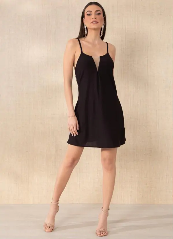 Vestido em malha de poliéster e elastano. Modelo decote vazado com tule, alçascom regulagem, decote costas com elastico. Comprimento curto.